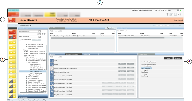 Large central portion of the screen below the Summary bar. The window displayed here will vary depending on the system function that is being used. It will typically contain the Event List or System Manager window. It can also display the Investigative or Assisted Treatment windows, the system help, and external documents or applications.