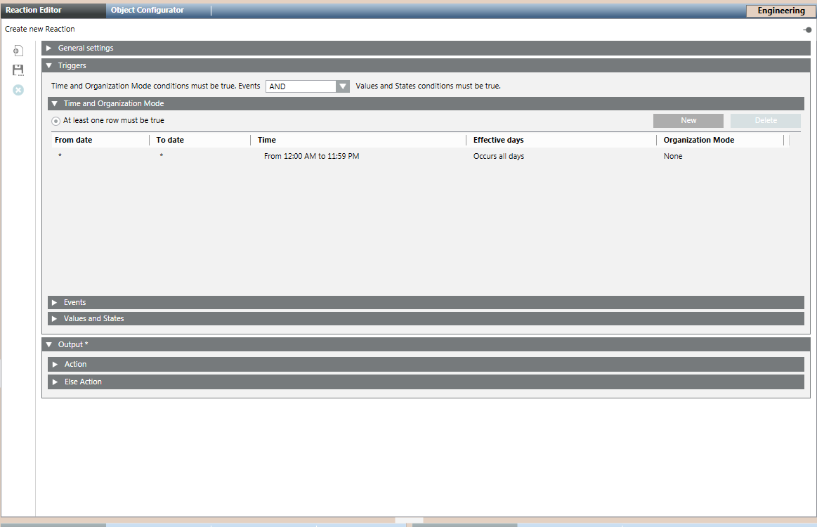 - In the Triggers expander, specify if the conditions specified in both, Events as well as Values and States, expanders must be true or if the conditions specified in either of the expanders must be true by selecting the appropriate operator (AND, OR) in the drop-down list.