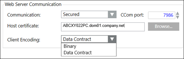 Client Encoding | With Web Server Communication mode as Secured/Local, the Client Encoding (Data Contract/ Binary) becomes available in the Web Server Communication. In the Client Encoding drop-down list, by default, Data Contract is displayed. Data Contract Serialization: The default and recommended client encoding strategy, Data Contract Serialization is implemented for its secure, explicit, and controlled serialization process, suitable for reliable data exchange across all sites. .NET Binary Serialization: Reserved for specific scenarios and upon specific instruction from HQ support, .NET Binary Serialization is an alternative client encoding that can be employed to address unique requirements or troubleshooting processes. |