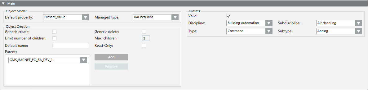 - Open the Main expander. For details about these fields, see Main Expander of an Object Model.