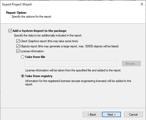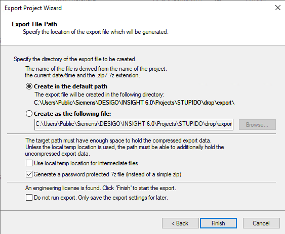 The Migration package option modifies the export package to meet your requirements for migrating a project to the Desigo CC management platform.