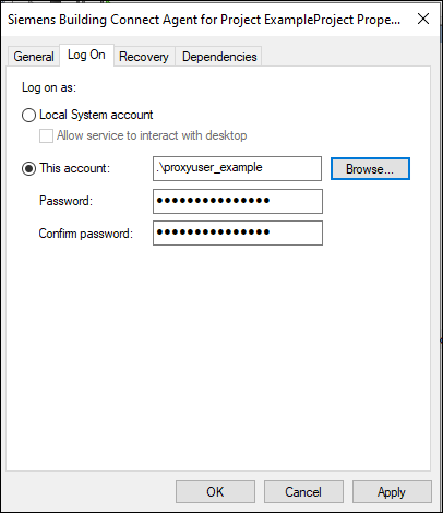 2. Set the Siemens Building Connect Agent Windows Service to run as the <proxyuser>