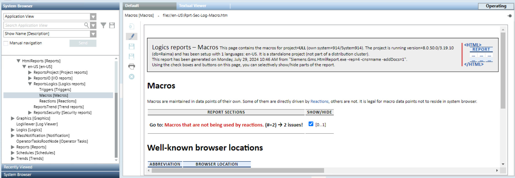 Logics reportsThe Logics report folder includes a set of logics-specific reports. Triggers reportMacros reportReactions report